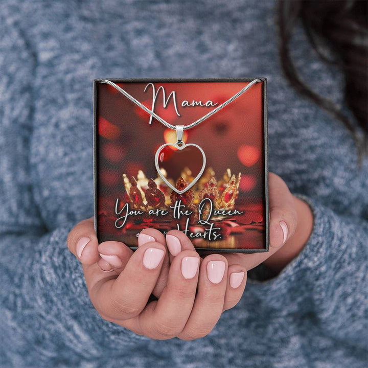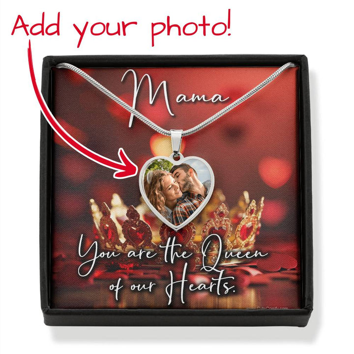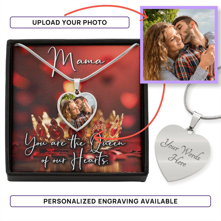 Mama, you are the queen of our hearts. Photo gift from husband and kids. Beautiful and sentimental necklace with pendant featuring your custom photo. Show your Wife or Mother she is the queen of the royal castle with elegant red hearts and a stunning gold crown background image. Meaningful song lyrics that touch the soul and heart. Create the perfect gift for her on Mother's day or any occasion. Mama you know I love you, loving you is like food for my soul. Share this touching and personalized jewelry that she will cherish for years to come. Design your own unique one of a kind photo necklace wit pictures of children, family and spouse.